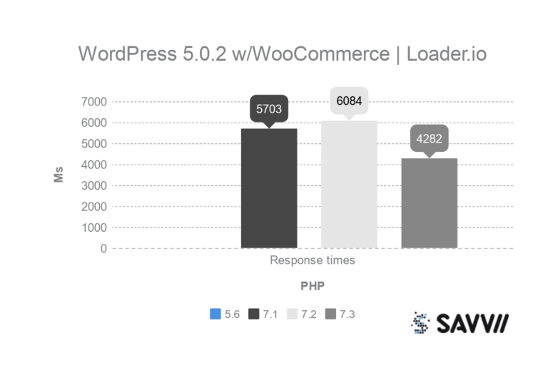 Tussen PHP 5.6 en 7.1 zien we weinig verschil. PHP 7.2 is al wat sneller, vooral op de Time to First Byte (TTFB), met bijna 25%. Op PHP 7.3 draait de site veruit het snelst, met een 17% snellere laadtijd dan 7.2 en maar liefst 44% snellere TTFB. Hoe zien de resultaten eruit voor Loader.io: